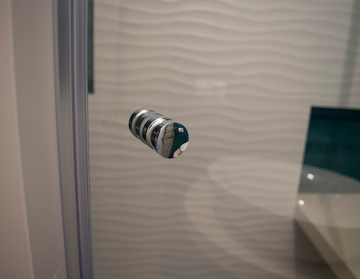 В процессе изготовления перегородок для душевых кабин мы используем только закаленное стекло толщиной от 8 до 10 мм. Оно надежно выдерживает удары и вибрации, а кромки тщательно отполированы.